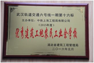 近日,從湖北省建筑工程管理局傳來喜訊,上海工程局市政公司武漢地鐵6號線16標項目部農(nóng)民工業(yè)校榮獲2015年度湖北省“優(yōu)秀建筑工地農(nóng)民工業(yè)余學校”稱號。